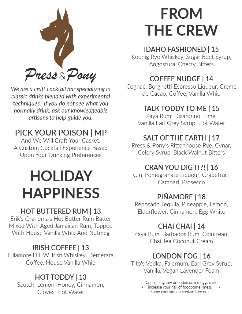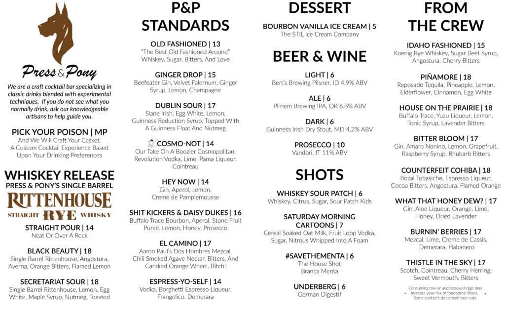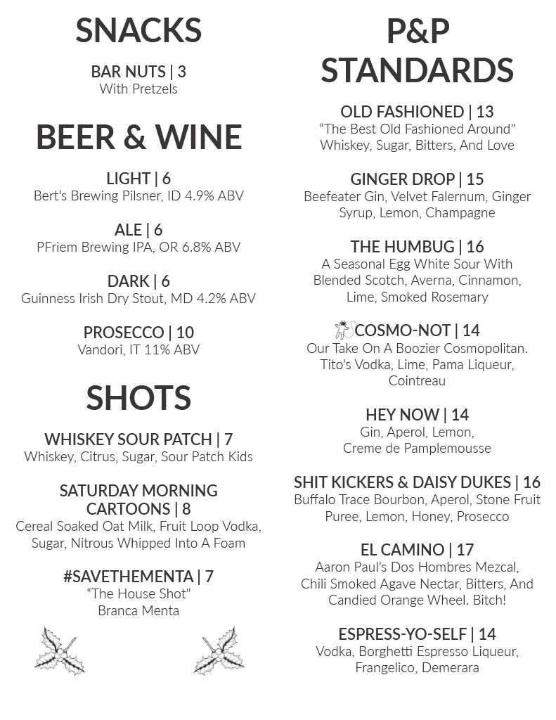 Menu We are a craft cocktail bar with a selection of spirits which best suit our tastes and knowledge. If you do not see what you normally drink, ask one of our knowledgeable staff to help guide you.